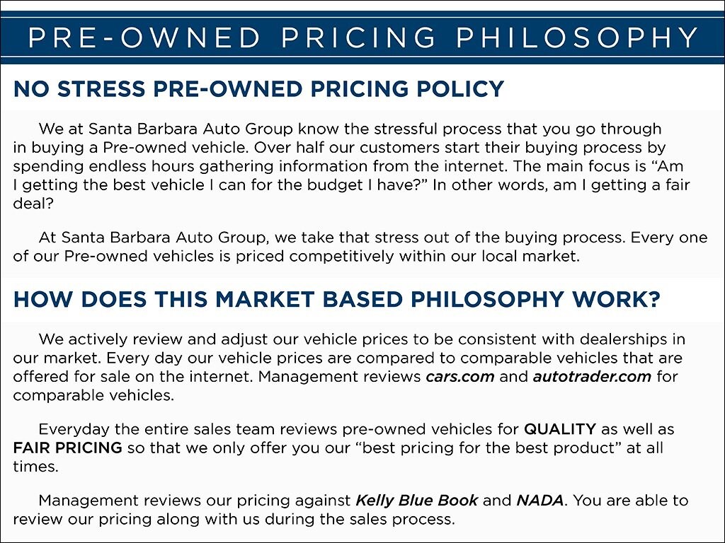 Choosing a fully reconditioned vehicle from Santa Barbara Auto Group is a decision that guarantees excellence and peace of mind. Our expert technicians meticulously inspect and refurbish each vehicle, ensuring they are in pristine condition, both inside and out. When you purchase from us, you're not just buying a car; you're investing in a driving experience that's virtually indistinguishable from new. Plus, our commitment to quality extends to our customer service, ensuring you have a trusted partner by your side. When you choose a fully reconditioned vehicle from Santa Barbara Auto Group, you're making a smart, value-driven choice for a top-tier driving experience.